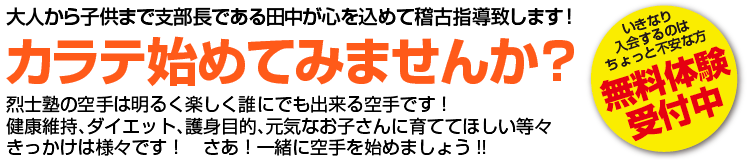 平瀬塾長が言われている「空手は人間造り、生きる力!」この言葉の意味を日々考えながら、指導させていただいています。人間誰しも、苦手な事があります。その苦手な事を烈士塾空手を学びながら、克服していって欲しいと思っています。私もみなさんと一緒に成長し、充実した毎日を送れる様に日々努力しています!